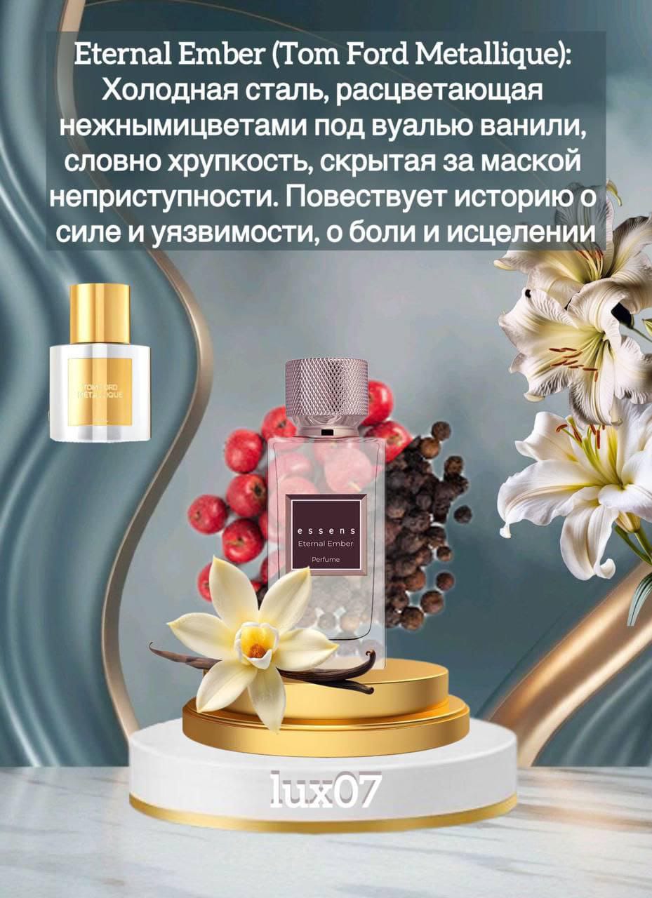 Духи ESSENS обладают высоким уровнем концентрации натуральной эссенции — целых 20%, благодаря чему её запах отличается насыщенностью и выразительностью. Аромат раскрывается в три ноты. Парфюм очаровывает своим многослойным звучанием, плавно переходящим от верхних нот к глубоким базовым аккордам, вызывая восхищение и оставаясь незабываемым впечатлением.